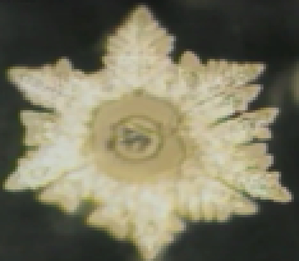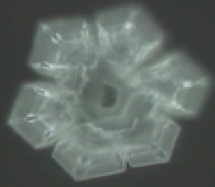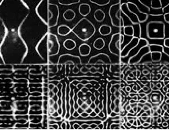 Visuellement, voici les formes orchestrées par certaines fréquences vibratoires en déposant du sel ou du sable sur une plaque à laquelle on imprime une vibration .