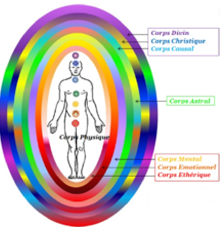 A l’instar de l’univers baignant dans un champ vibratoire informationnel, et à l’instar de notre terre entourée de sa protection électro magnétique, notre corps est lui aussi entouré d’un champ électromagnétique. Et oui, nous avons tous une signature vibratoire unique tout comme les empreintes des doigts ! Cette signature est composée de corps subtils vibratoires qui s’imbriquent comme des poupées russes. C’est un manteau dont les boutons sont des roues énergétiques situées sur notre corps. Elles sont aussi appelées chakras dans les traditions ancestrales. Chacun de ces corps subtils réagit à notre environnement. Ces enveloppes sont conscientes, sensibles et intelligentes. Leur qualité vibratoire dépend de notre mode de pensée ainsi que des émotions qui lui sont associées. Chaque corps subtil a sa fonction propre. Le corps émotionnel mémorise les émotions et les croyances ancrées par nos expériences de vie. Le corps mental enregistre nos expériences de vie. Le premier de ces corps est le corps éthérique (vous vous souvenez l’éther dont on a parlé plus haut pour l’univers !) qui assure la cohésion de notre corps physique et contient la réplique vibratoire de tout notre corps physique et donc de nos organes.